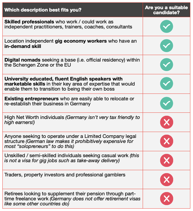 The residence permit allowing you to work as a freelancer in Germany is the easiest route for anyone who doesn’t have qualifiactions or work experience in the types of professions that the Germans have skills shortages for.