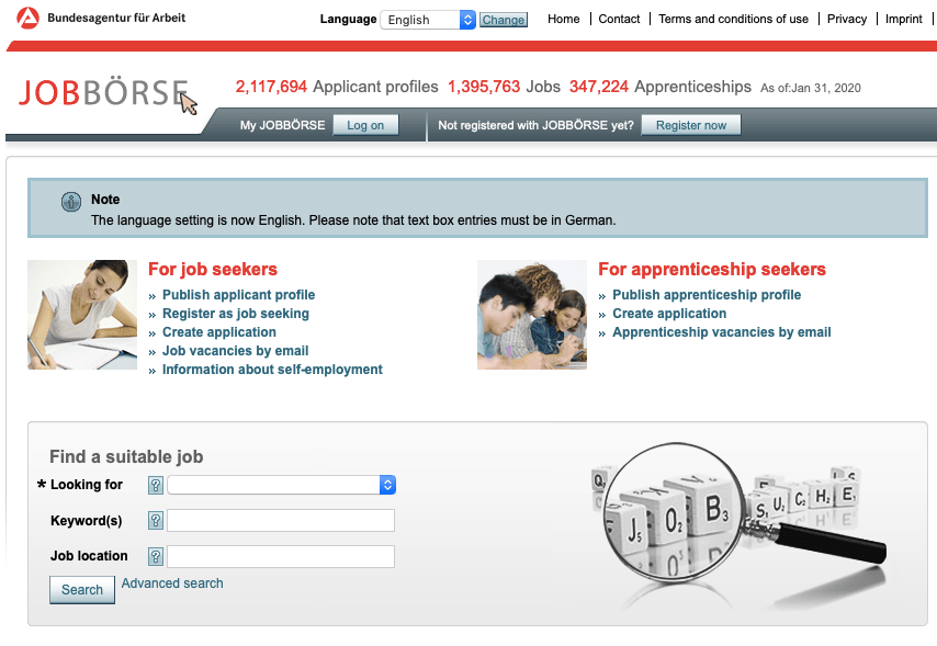 The site and portal itself has some English language functionality. You can navigate through the JOBBÖRSE in English. You can also search for open positions by entering English job titles, which will be automatically translated into German. Search results will then appear in German, too.