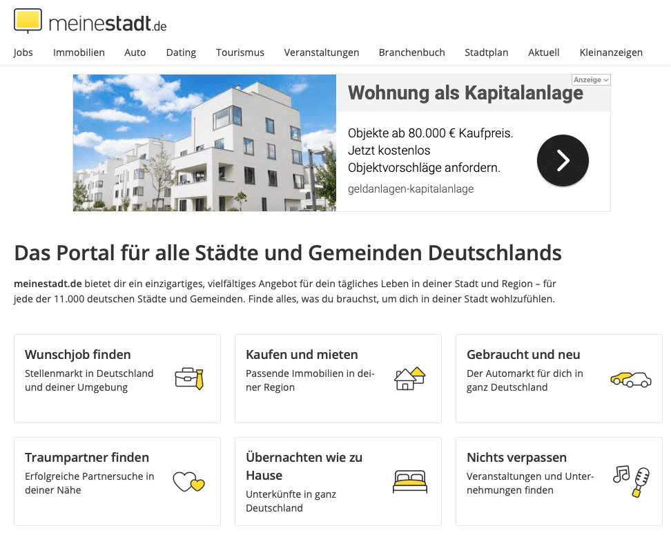 It’s also worth noting that Meinestadt isn’t JUST a jobs portal (the clue is in the name), nor is it their primary focus. It’s essentially a directory and a portal for your local area. As such, they also offer pages with property for rent, a dating portal and cars for sale.